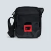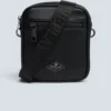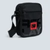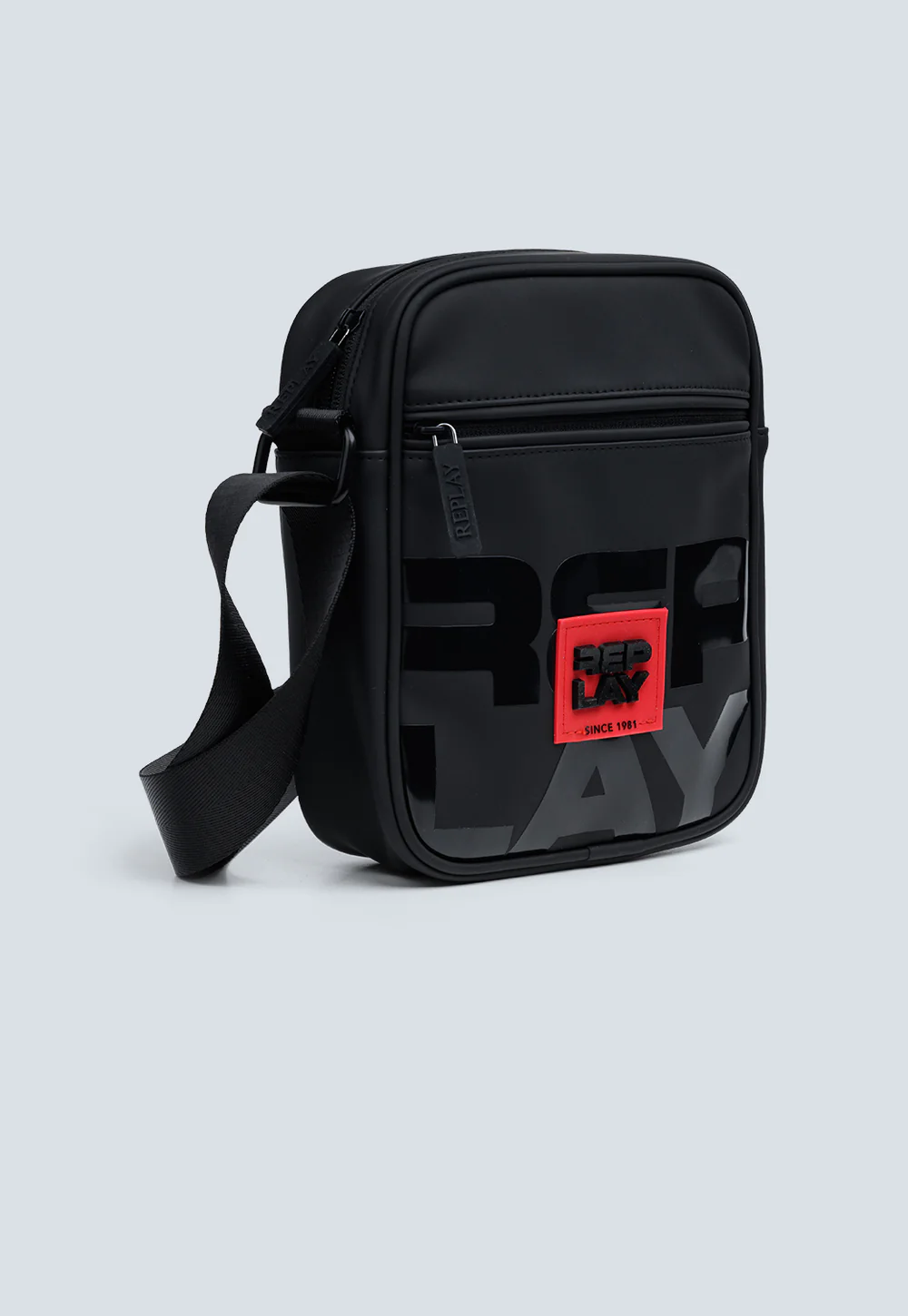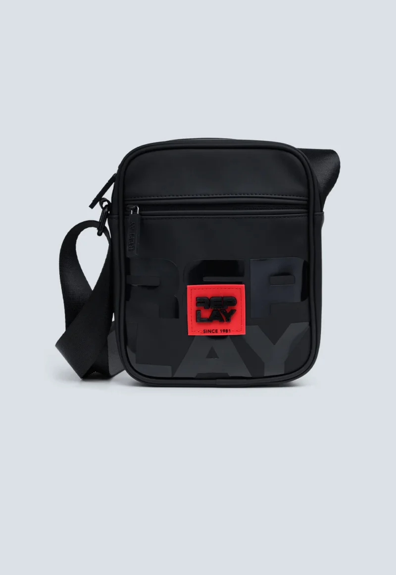 תיק צד אופנתי לגברים בצבע שחור עם עיצוב גרפי מודגש – כולל הדפס לוגו מוקטן ובולט בגוון שחור מט, לצד תג אדום עם כיתוב REPLAY במרכז.