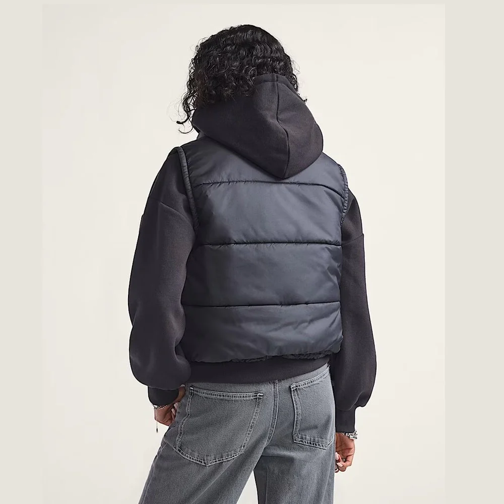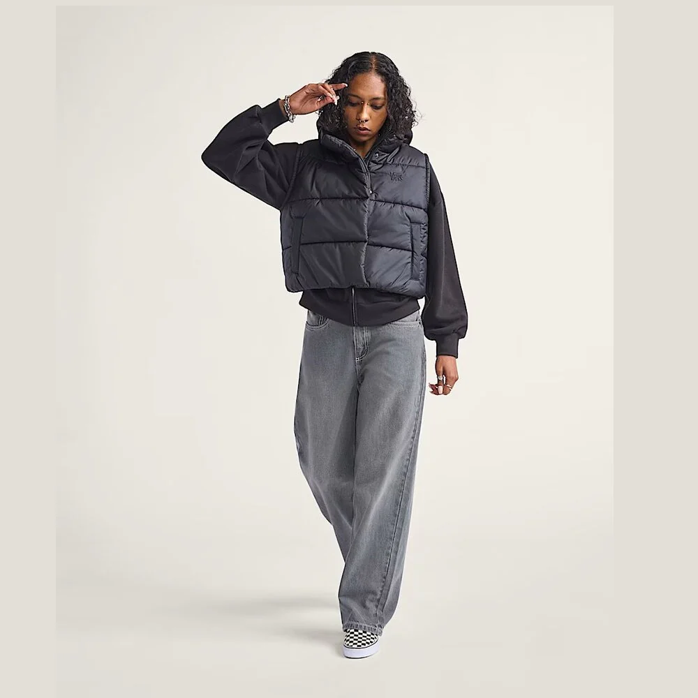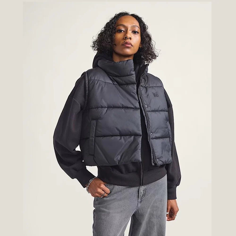 ווסט מרופד שחור של VANS בעיצוב נוח ומחמם, עם לוגו עדין בחזית. מושלם לשכבות וסטייל יומיומי.