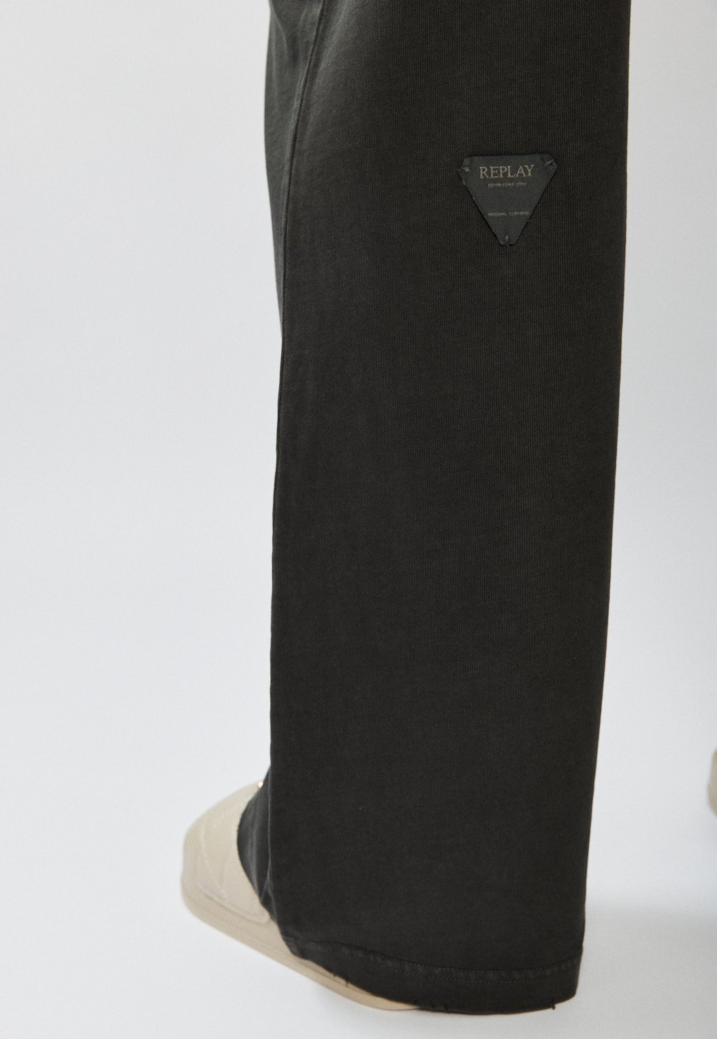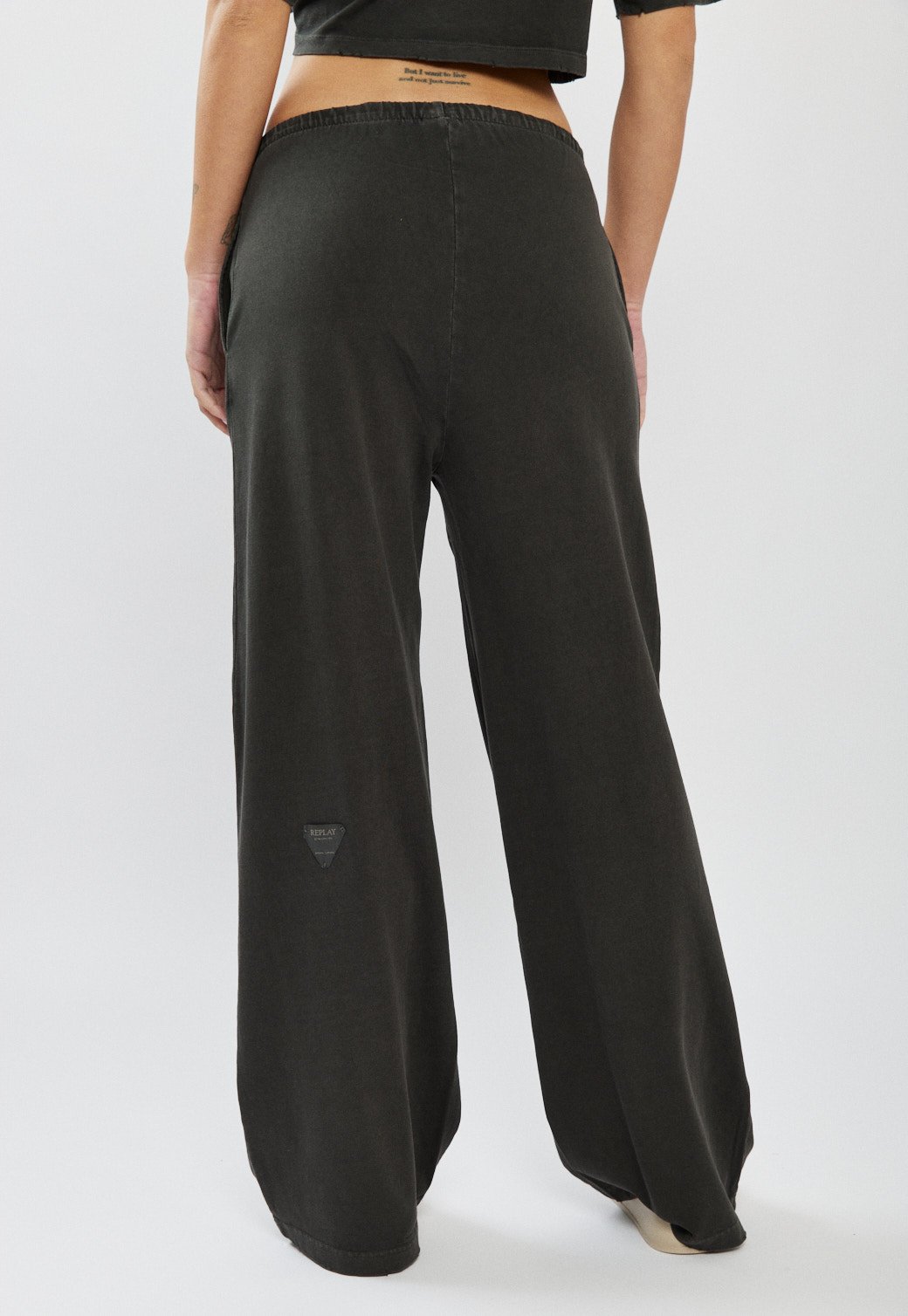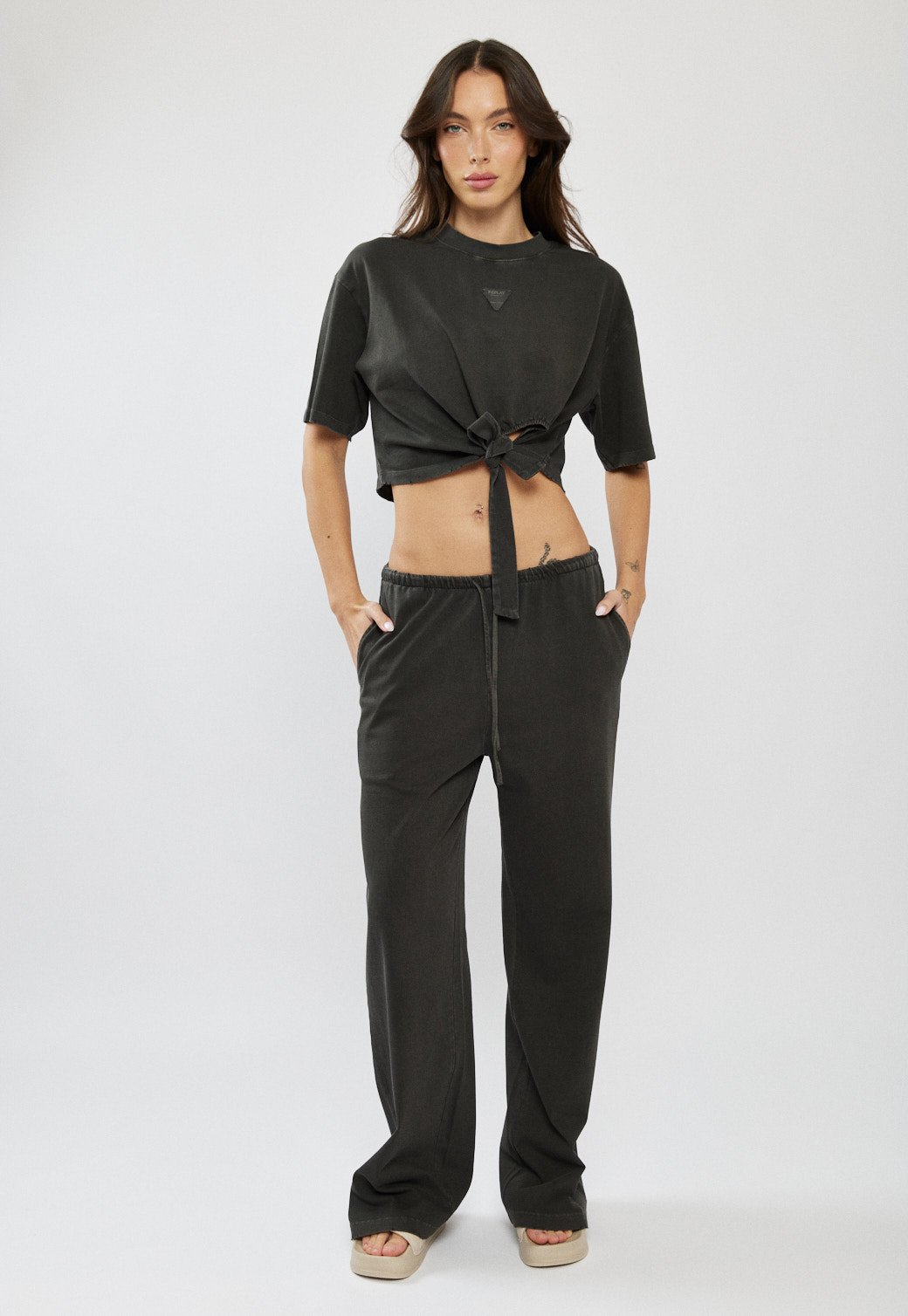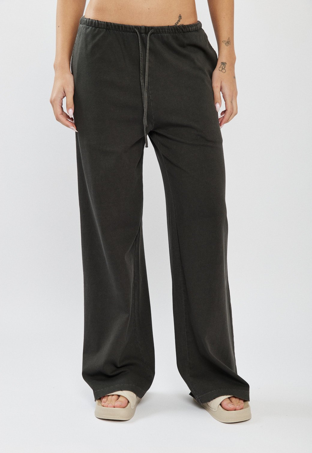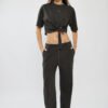 מכנס שחור בגזרה רחבה, עם גומי במותן ושרוך לקשירה. נוח ומתאים ללבוש יומיומי.
