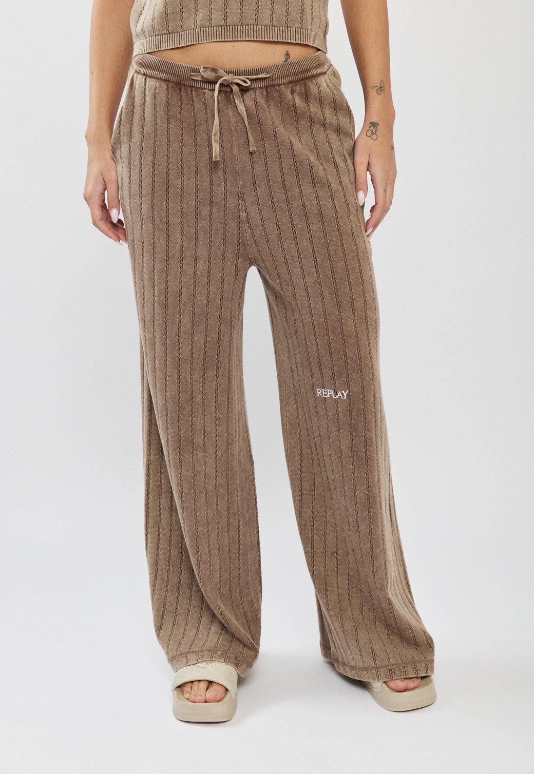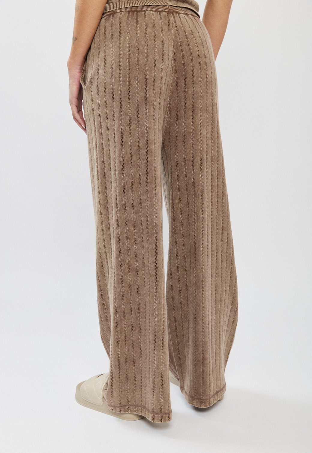 מכנסיים ארוכים לנשים בגזרה רחבה ונינוחה, עשויים מבד כותנה עם טקסטורת ריב אנכית שמעניקה מראה מחמיא וזורם. מגיעים בגוון חום טבעי עם גומי במותן ושרוך להתאמה אישית ונוחות מקסימלית. הדיטייל של המרקם יחד עם הגזרה הרחבה יוצר לוק קז׳ואל אופנתי, ומתאים במיוחד לשילוב עם חולצה תואמת לסט מושלם.