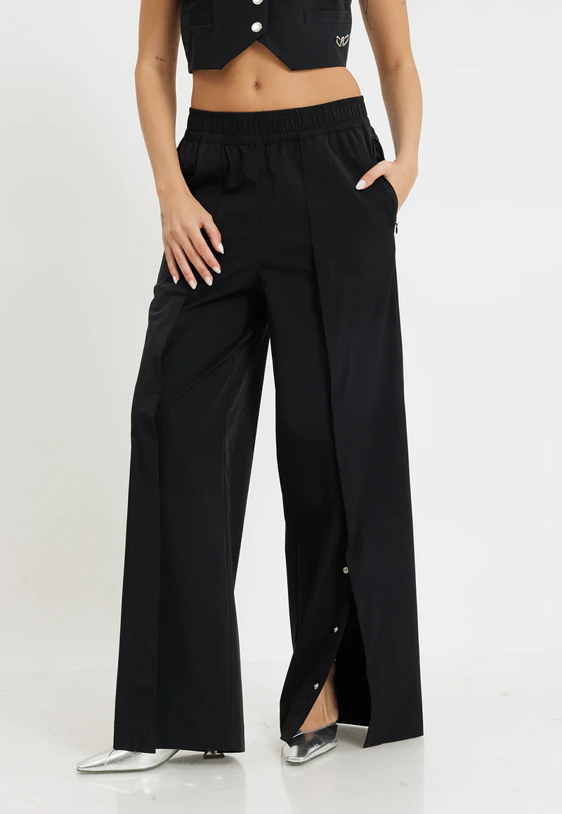 מכנסיים אלגנטיים בגזרה ישרה עם שסעים וכפתורי מתכת ייחודיים שמוסיפים טאץ' מתוחכם לכל לוק. גומי במותן לנוחות מקסימלית והתאמה מושלמת. פריט חובה לארון שמשתלב נהדר עם וסט תואם או חולצה קלאסית.