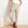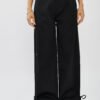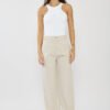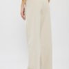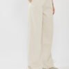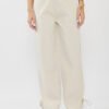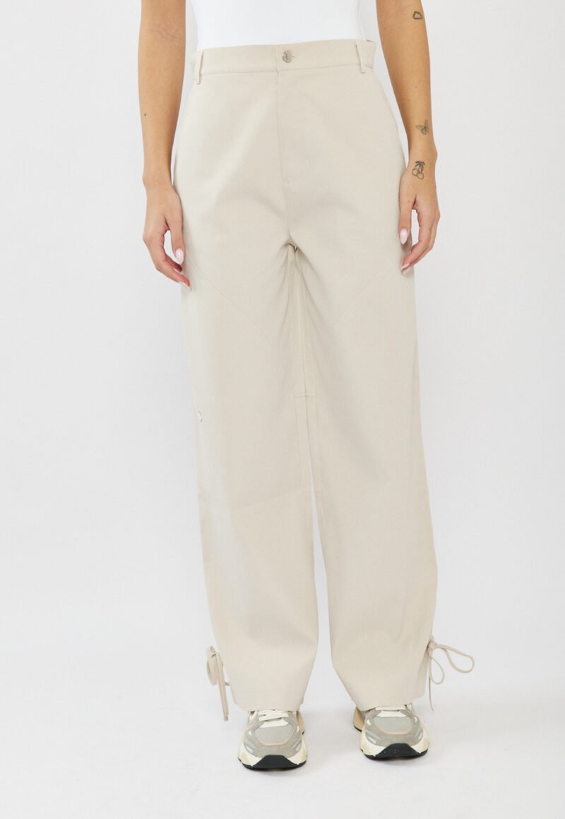 מכנסיים רחבים לנשים בצבע בז׳ בהיר בעיצוב נינוח ומודרני, עם גזרה רחבה ונשפכת שמעניקה מראה מחמיא ונוח. כוללים סגירה קדמית קלאסית ושרוכים בתחתית הרגל להתאמה אישית וליצירת מראה מתכוונן.