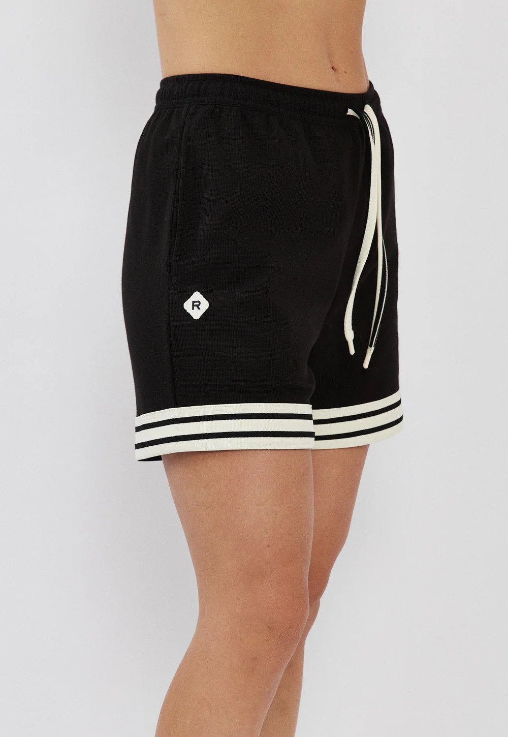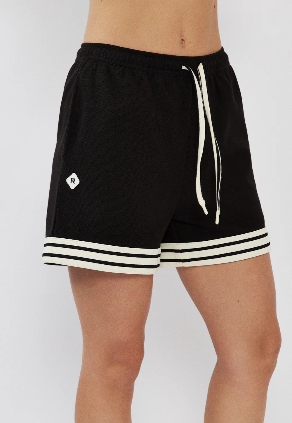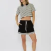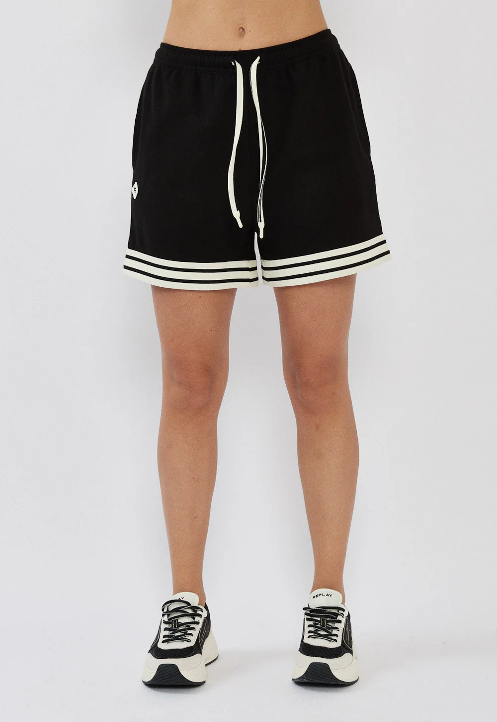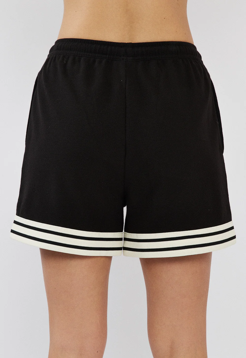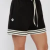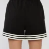 מכנסיים קצרים לנשים בצבע שחור בעיצוב ספורטיבי ונקי, עם פסים לבנים בשוליים שמוסיפים טאץ’ טרנדי ומדויק.