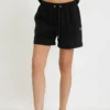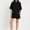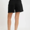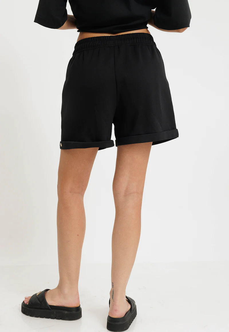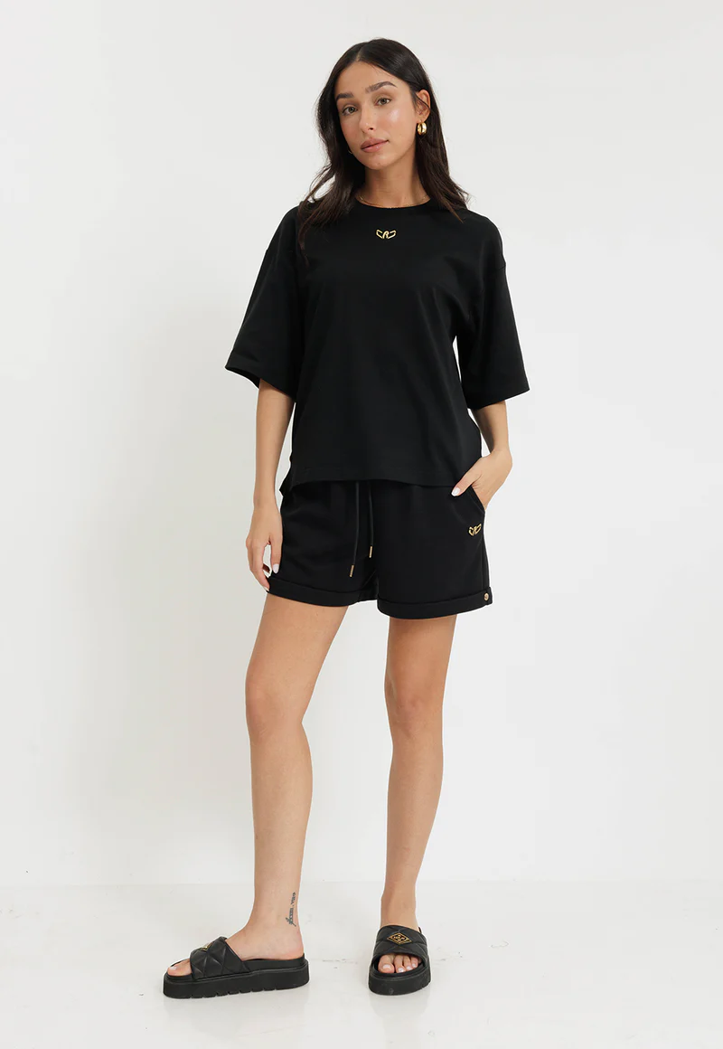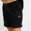 שורטס קצרים לנשים בגוון שחור קלאסי, עשויים בד אינטרלוק רך ונעים למגע. כוללים גומי במותן עם שרוך להתאמה אישית, כיסים צדדיים, ולוגו זהוב קטן בצד להשלמת הלוק.