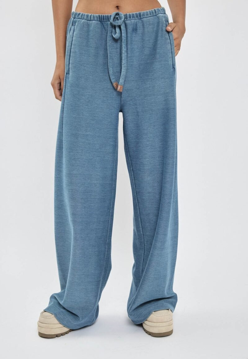 מכנסי טרנינג לנשים בגוון כחול בגזרה רחבה ונינוחה. מותן אלסטית עם שרוך, נפילה ישרה שמחמיאה לכל מבנה גוף ושסע קצר בצדי עם רוכסן המכפלת למראה עדכני. רסטילי שמתאים ללוק יומיומי נוח ומלא סטייל.