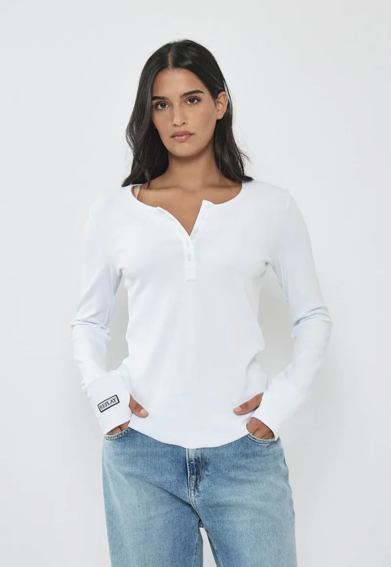 חולצת ריב בגזרה צמודה ונעימה עם שרוול ארוך. מגיעה בצבע לבן עם כפתורים בחזה ולוגו קטן על השרוול. מתאימה לשילוב יומיומי מתחת לשכבות או כלוק בסיס נקי ומדויק.
