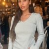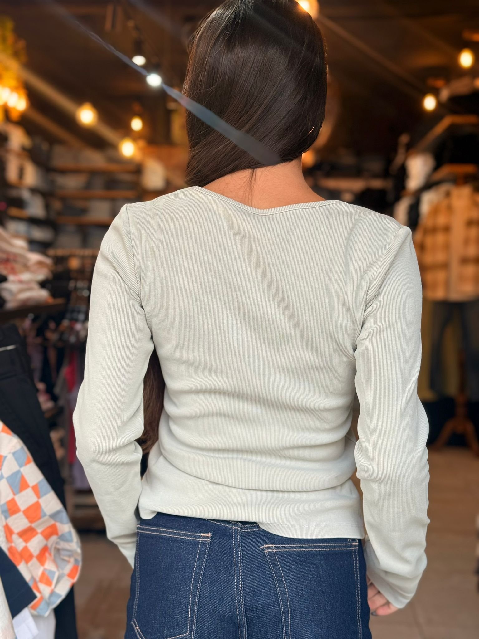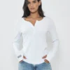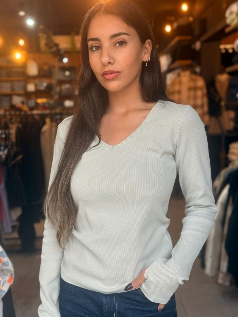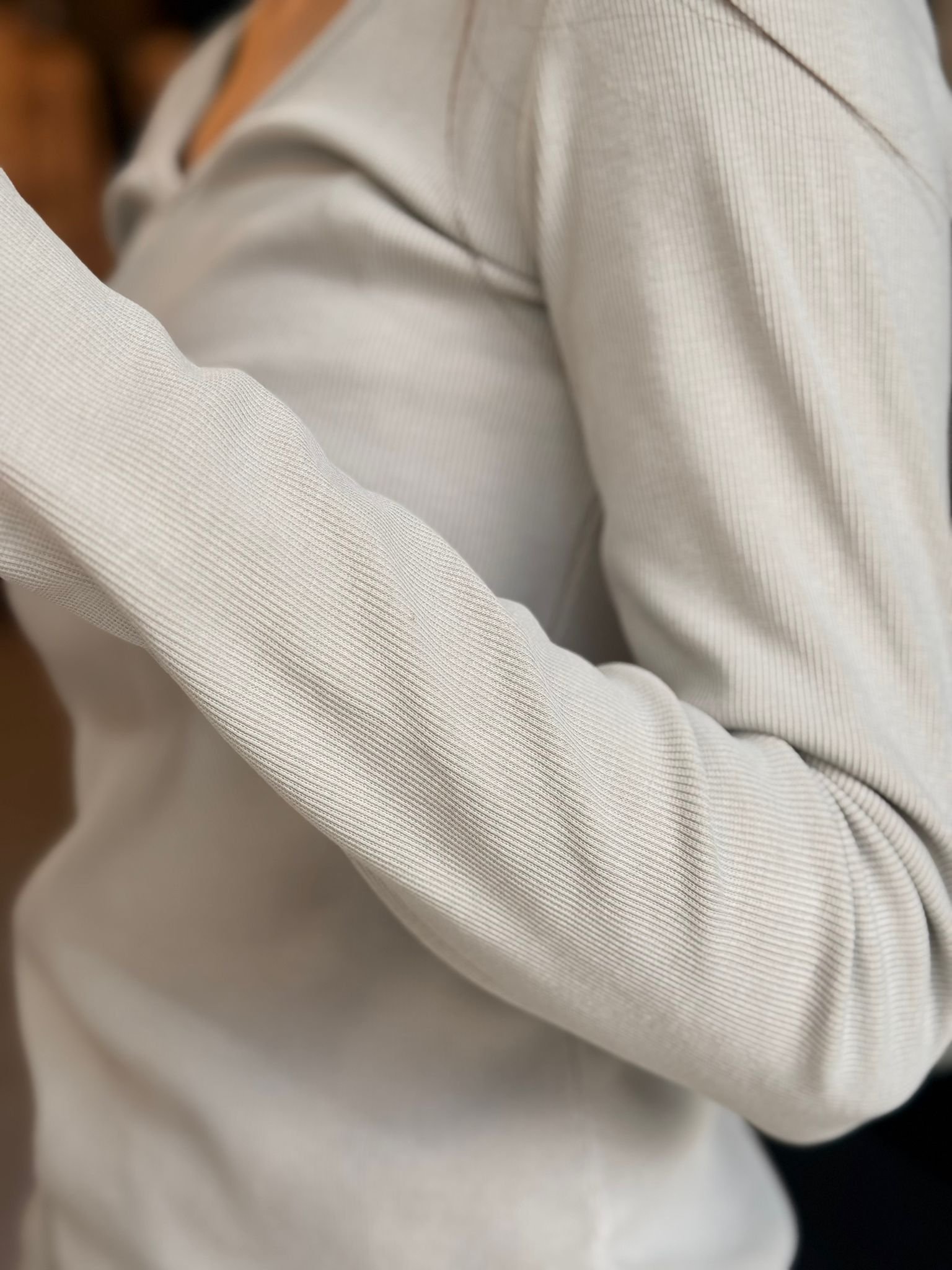 חולצת ריב לנשים בצבע אפור בהיר, בגזרת V מחמיאה עם שרוולים ארוכים. עשויה מבד כותנה נעימה לנוחות וגמישות לאורך כל היום.