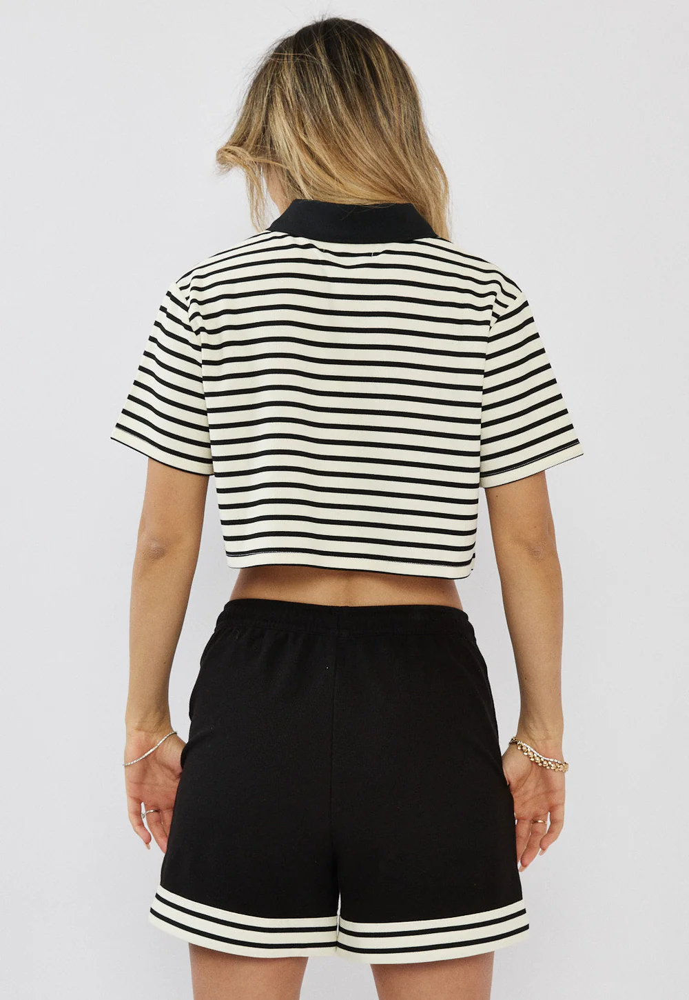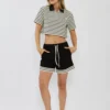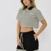 טי-שירט קצרה לנשים בצבע שחור עם פסים לבנים בעיצוב ספורטיבי ועדכני.