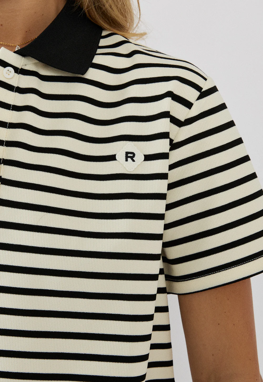 הדגם כולל שרוולים קצרים וצווארון פולו למראה טרנדי עם טאץ’ רטרו.