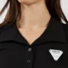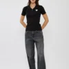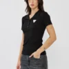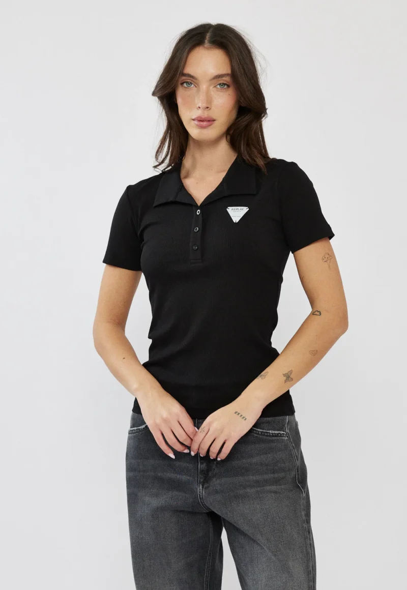 חולצת פולו לנשים בגזרה מחמיאה וצמודה בצבע שחור, עשויה בד כותנה נעים למגע ונוח ללבישה יומיומית. כוללת צווארון קלאסי עם סגירת כפתורים קדמית ולוגו קטן בחזית להשלמת המראה. מתאימה לשילוב עם ג׳ינס או מכנס מחויט ליצירת לוק נקי, אלגנטי וקז׳ואלי כאחד.