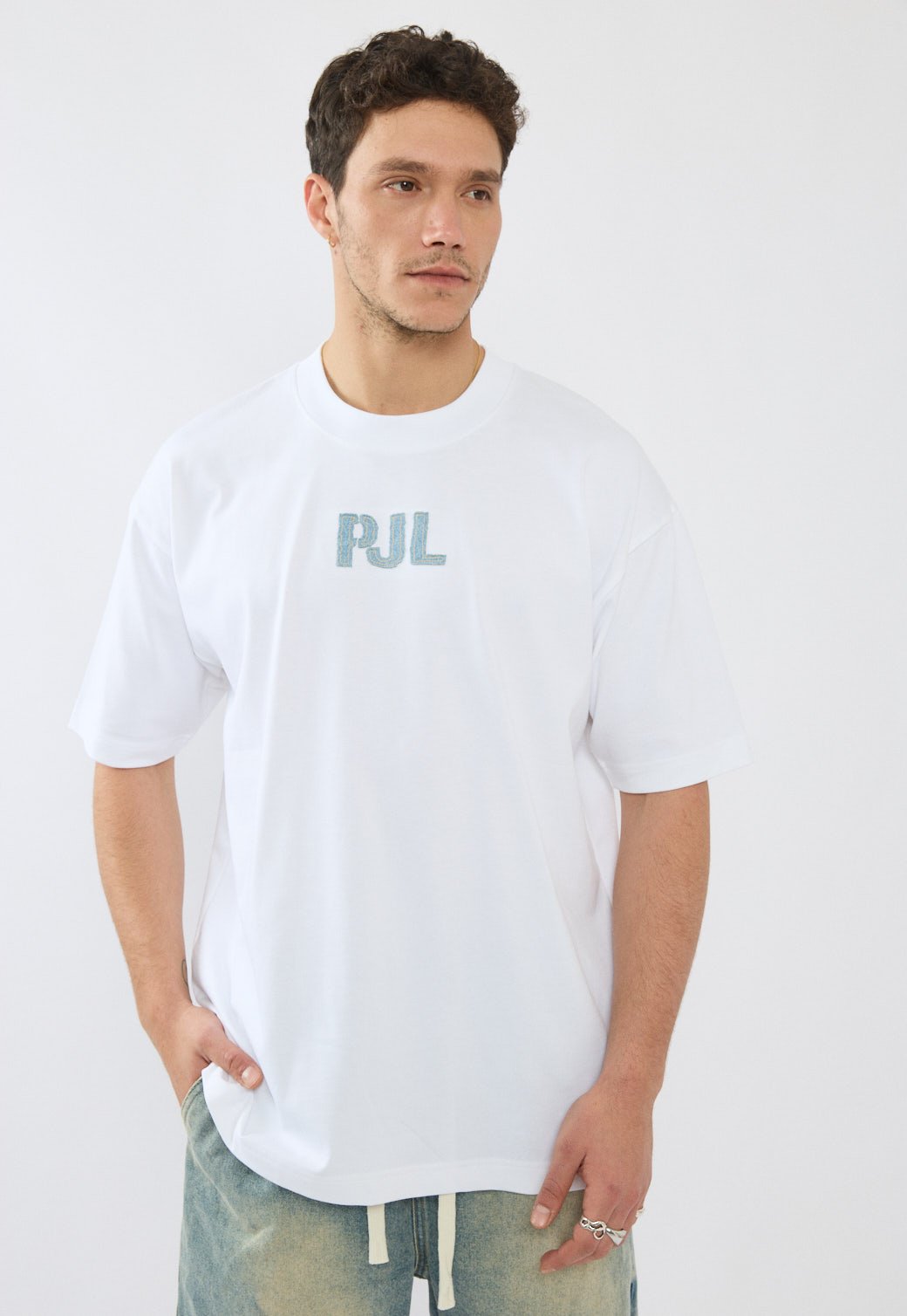 טי־שירט לבנה לגבר בעיצוב נקי עם הדפס PJL בחזית והדפס גדול בגב. גזרה נוחה וקלאסית המתאימה ללבוש יומיומי ולמראה קז’וא