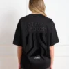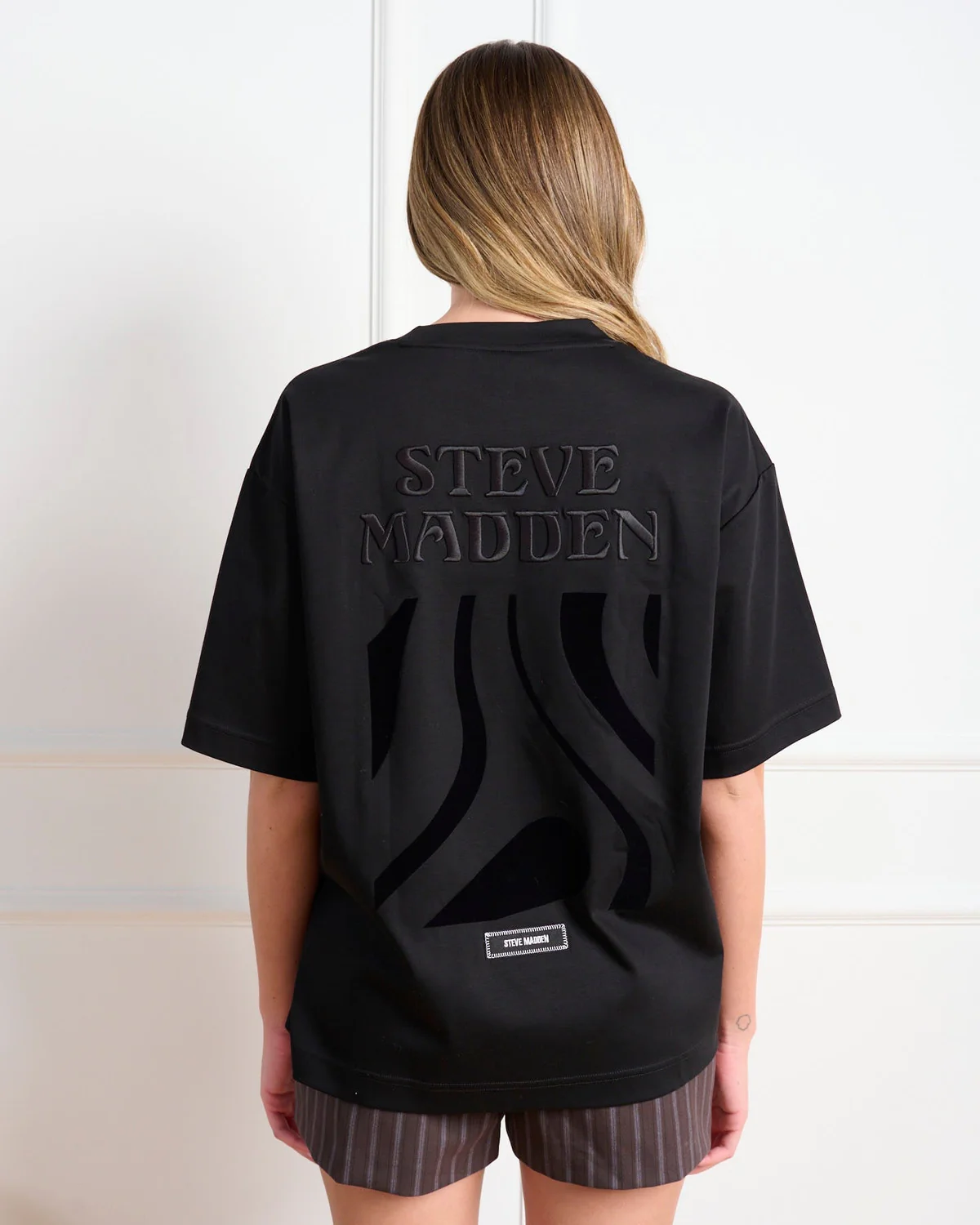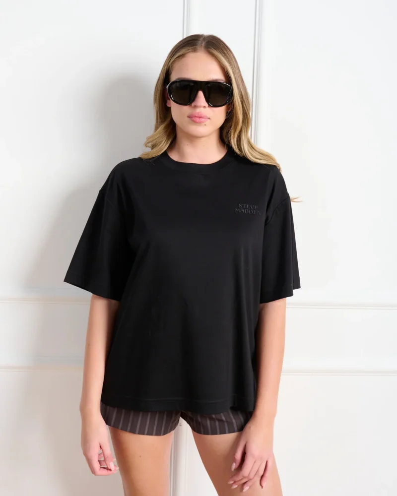 חולצת טי שחורה ואוברסייז מבית Steve Madden, עשויה מבד רך ונעים למגע. החולצה כוללת לוגו קטן ומודפס בחזית, והדפס גדול ובולט בגב עם כיתוב המותג. העיצוב מודרני וקז’ואלי, מתאים ללבוש יומיומי ומשתלב בקלות עם מגוון פריטים.