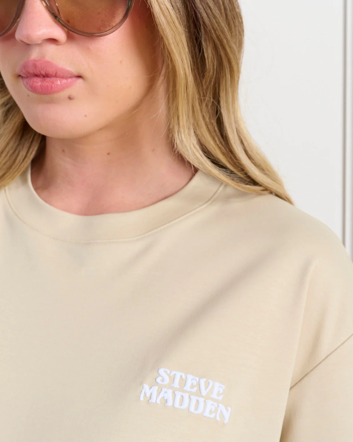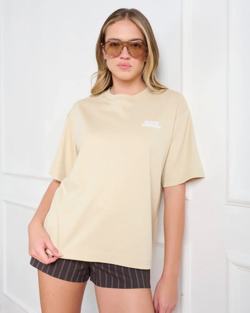 חולצת טי בגוון בז' ואוברסייז מבית Steve Madden, עשויה מבד רך ונעים למגע. החולצה כוללת לוגו קטן ומודפס בחזית, והדפס גדול ובולט בגב עם כיתוב המותג. העיצוב מודרני וקז’ואלי, מתאים ללבוש יומיומי ומשתלב בקלות עם מגוון פריטים.