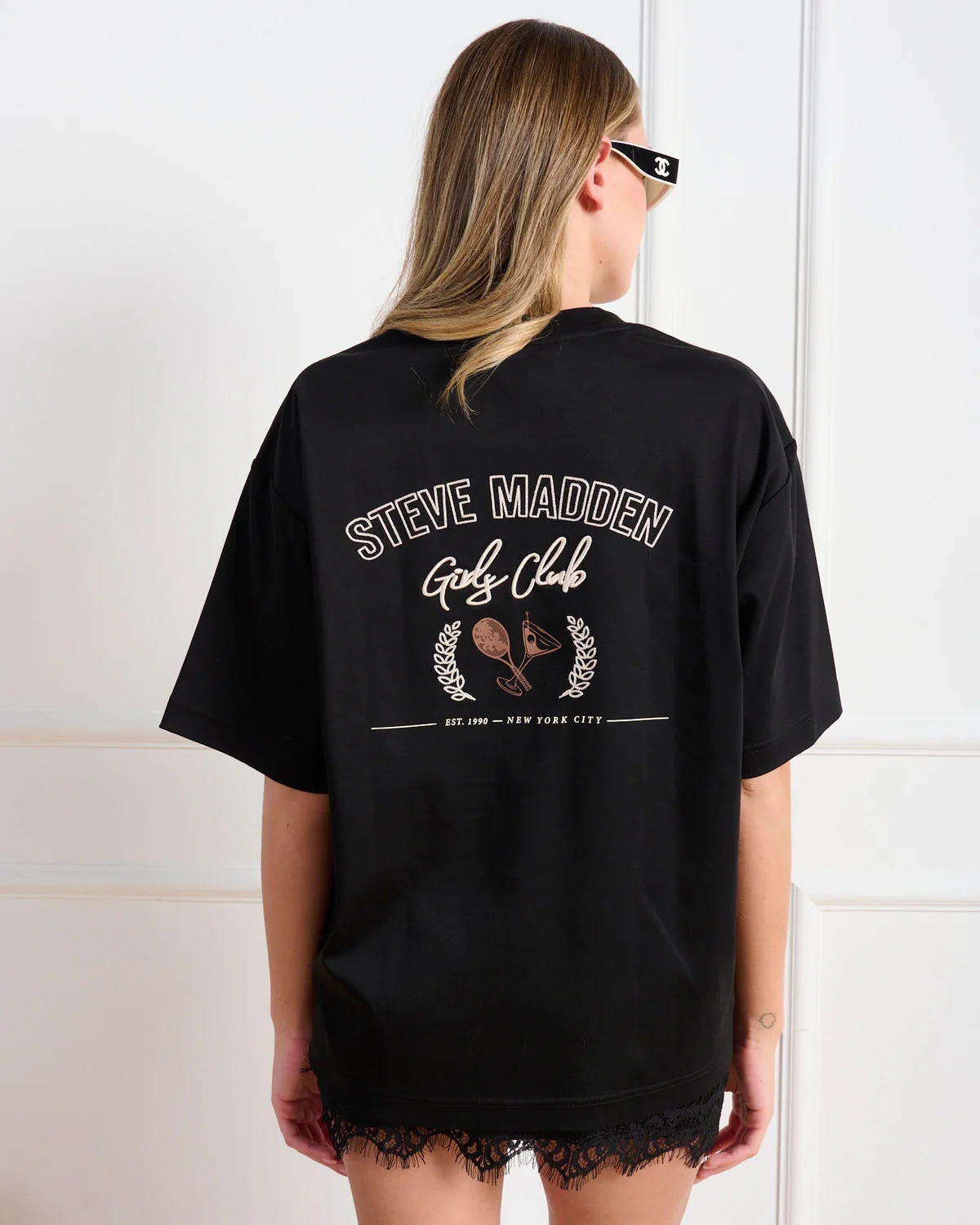 חולצת טי שחורה ואוברסייז מבית Steve Madden, עשויה מבד רך ונעים למגע. החולצה כוללת לוגו קטן ומודפס בחזית, והדפס גדול ובולט בגב עם כיתוב המותג. העיצוב מודרני וקז’ואלי, מתאים ללבוש יומיומי ומשתלב בקלות עם מגוון פריטים.