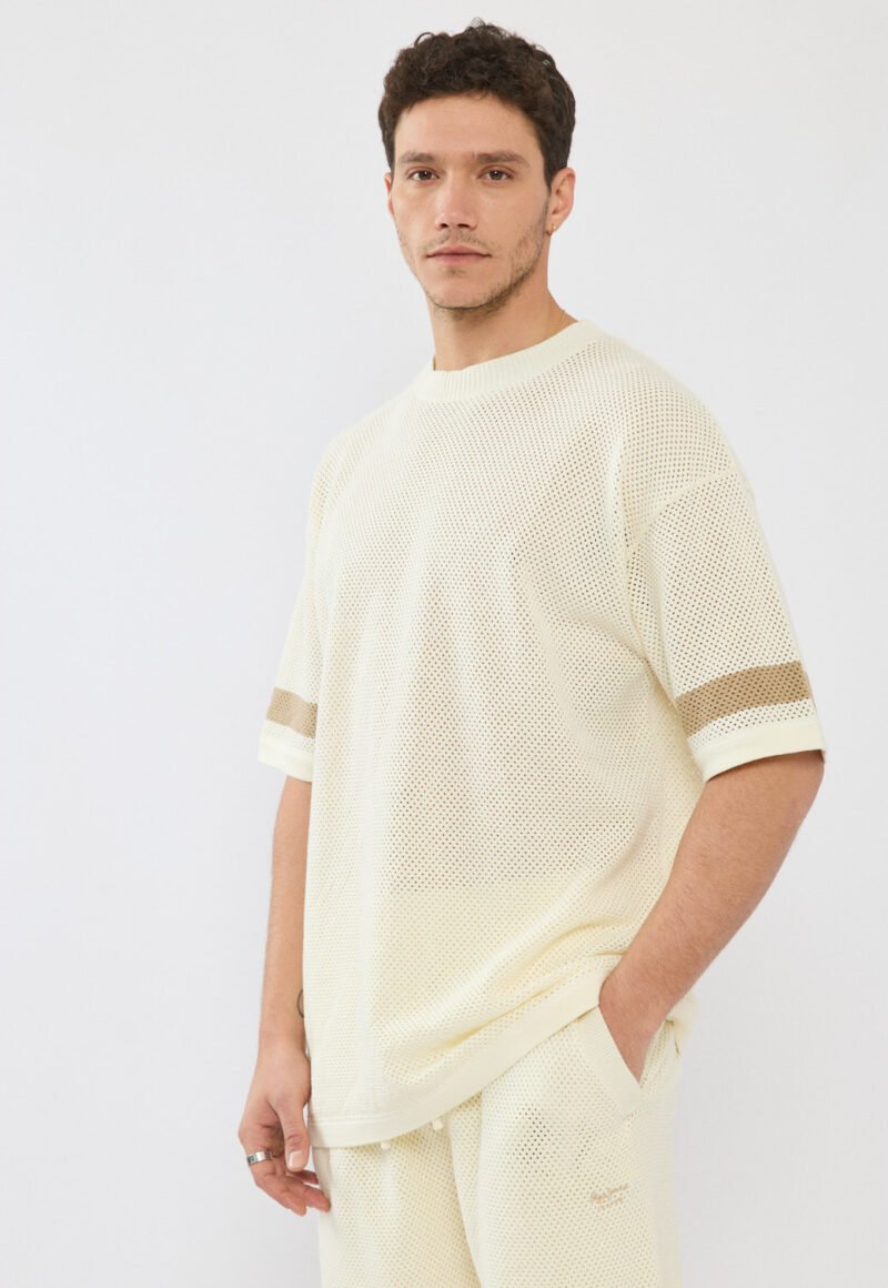 טי־שירט לגברים בעיצוב נקי ומודרני עם טקסטורת סריג עדינה המעניקה מראה ייחודי ואופנתי. החולצה נוחה במיוחד ומתאימה לשימוש יומיומי.