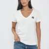 חולצת טי לנשים עם מפתח וי מחמיא וסמליל R בחזית. עשויה מבד כותנה לייקרה נעים וגמיש שמעניק תחושת נוחות וגזרה נשית. מתאימה לשילוב עם ג’ינס ללוק יומיומי נקי או עם חצאית ללוק אלגנטי יותר.