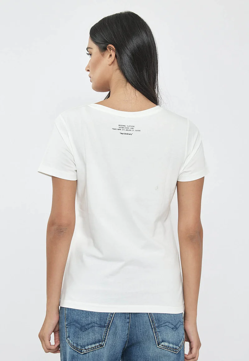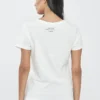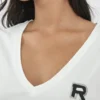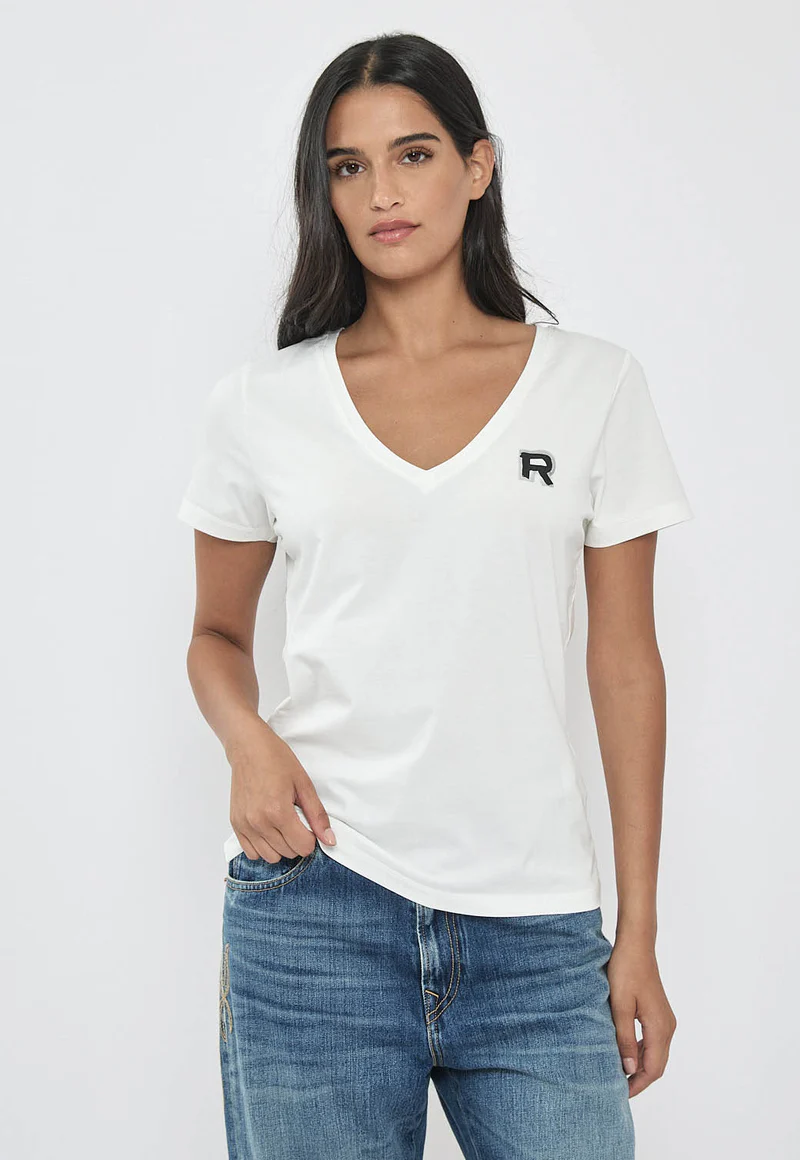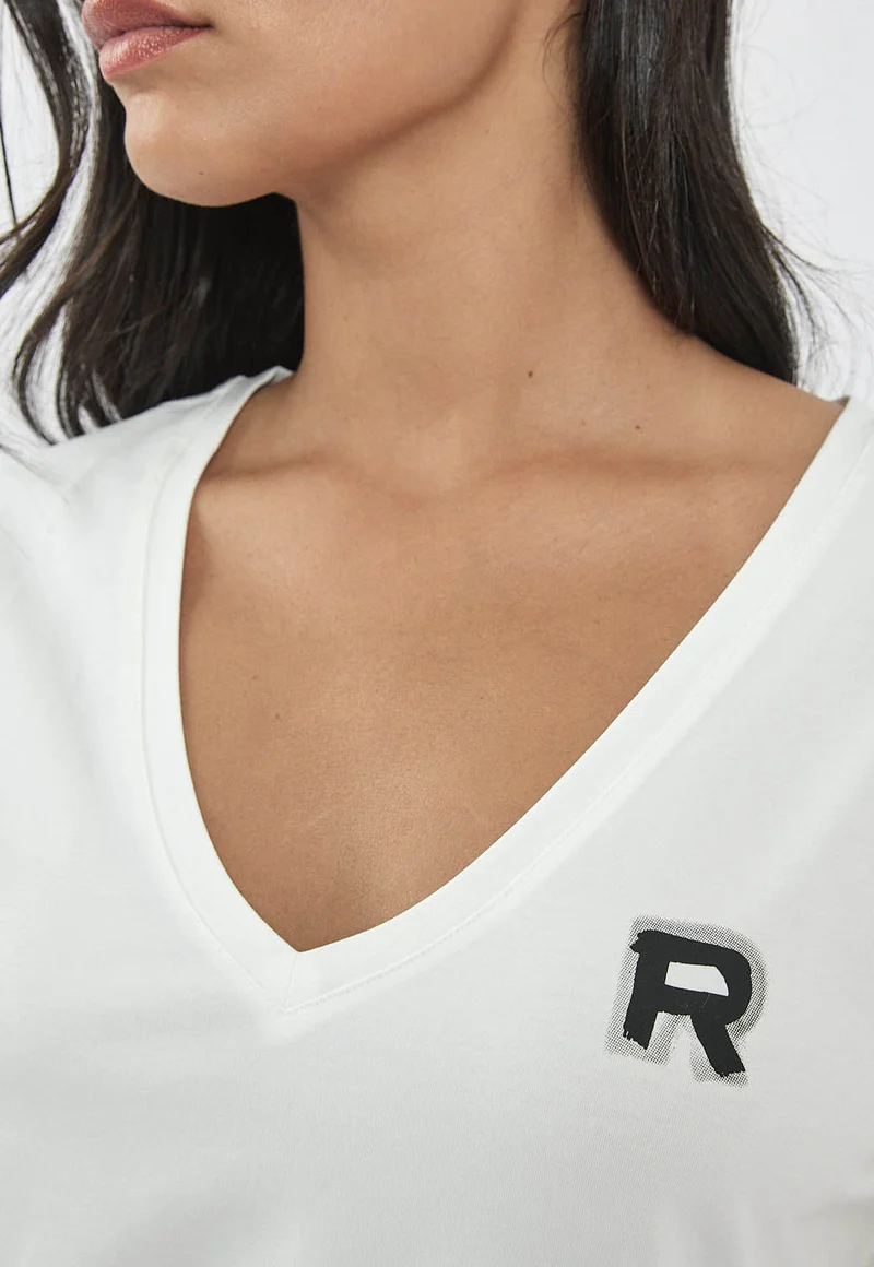 חולצת טי לנשים עם מפתח וי מחמיא וסמליל R בחזית. עשויה מבד כותנה לייקרה נעים וגמיש שמעניק תחושת נוחות וגזרה נשית. מתאימה לשילוב עם ג’ינס ללוק יומיומי נקי או עם חצאית ללוק אלגנטי יותר.