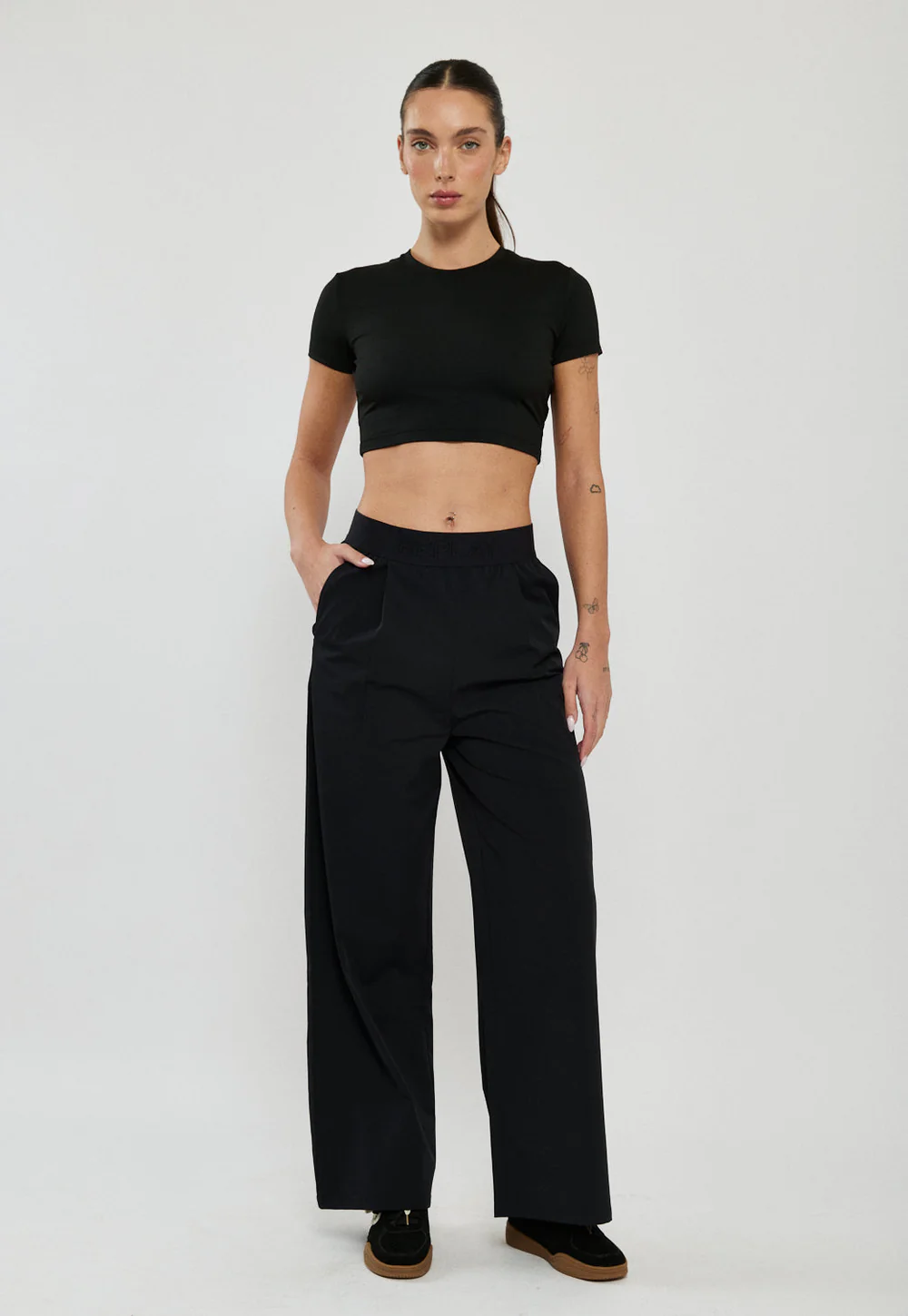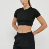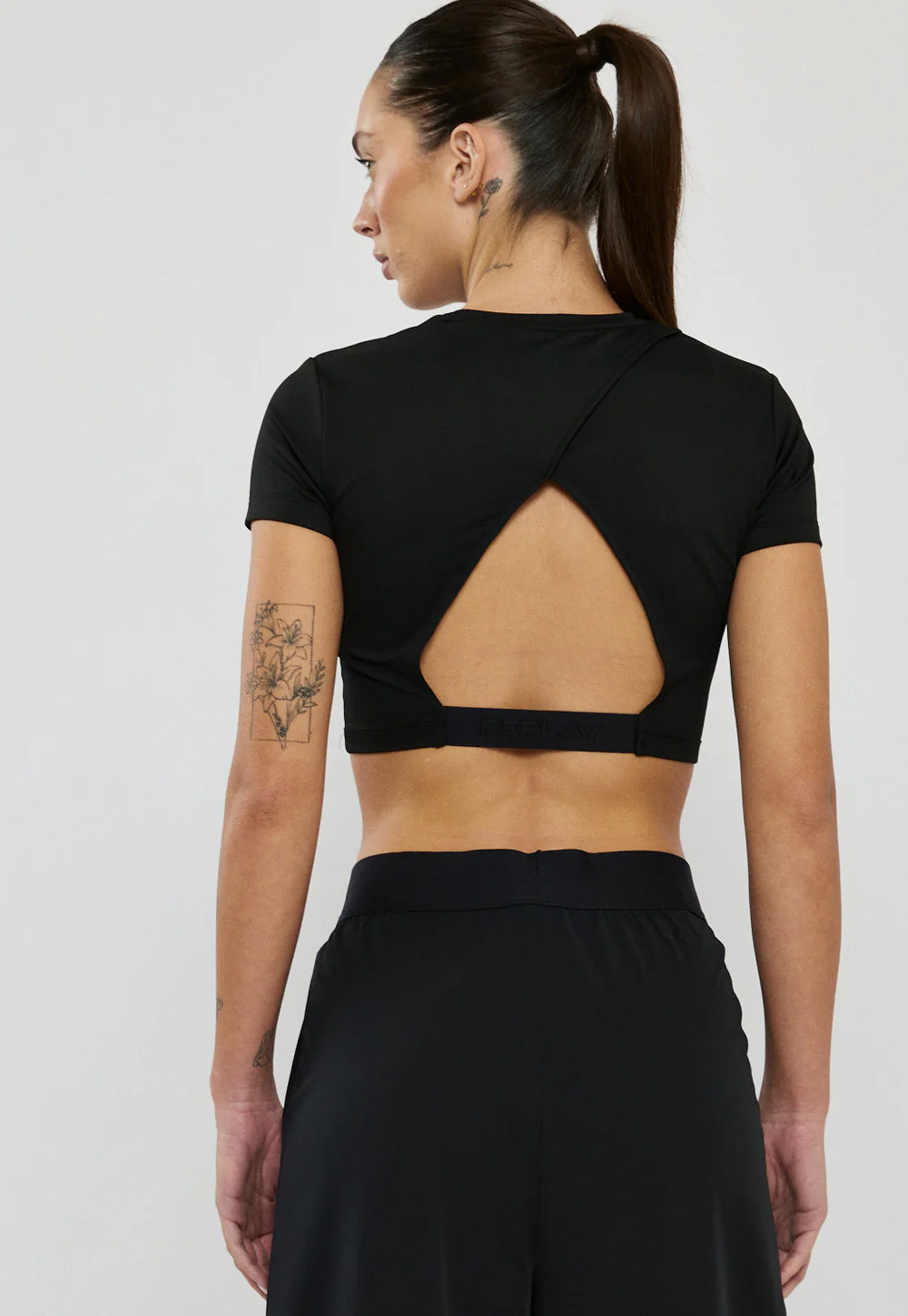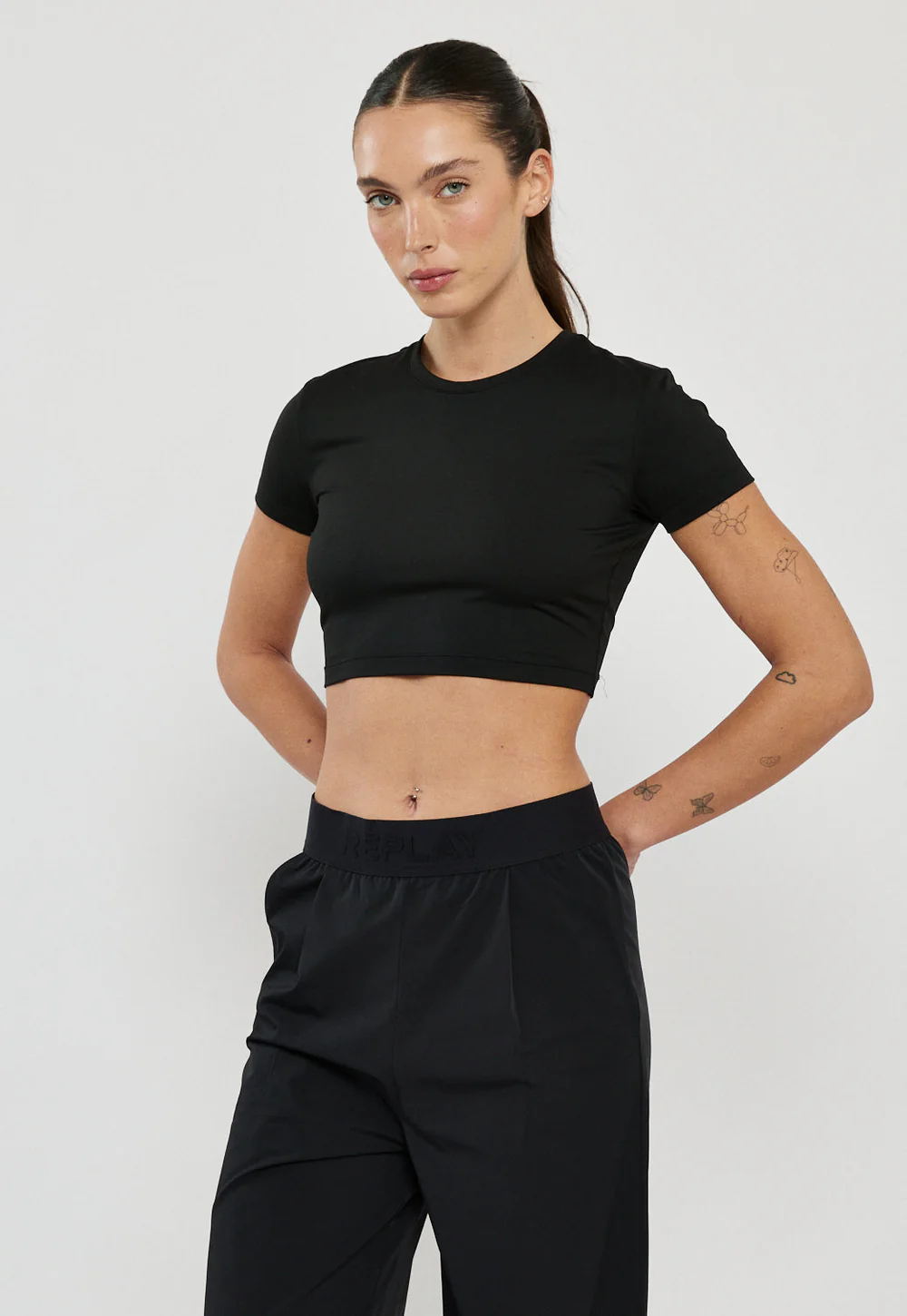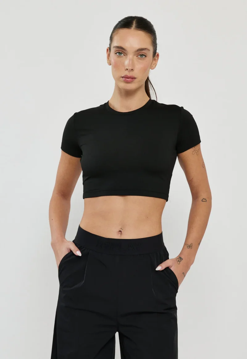 טי-שירט קצרה לנשים בגזרת קרופ בצבע שחור, בעיצוב מינימליסטי וספורטיבי. עשויה בד כותנה עם אלסטיות קלה לנוחות מרבית והתאמה מחמיאה לגוף. מושלמת לאימונים, לשעות הפנאי או לשילוב עם טייץ ומכנס ספורט ליצירת לוק אקטיבי ועדכני.