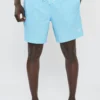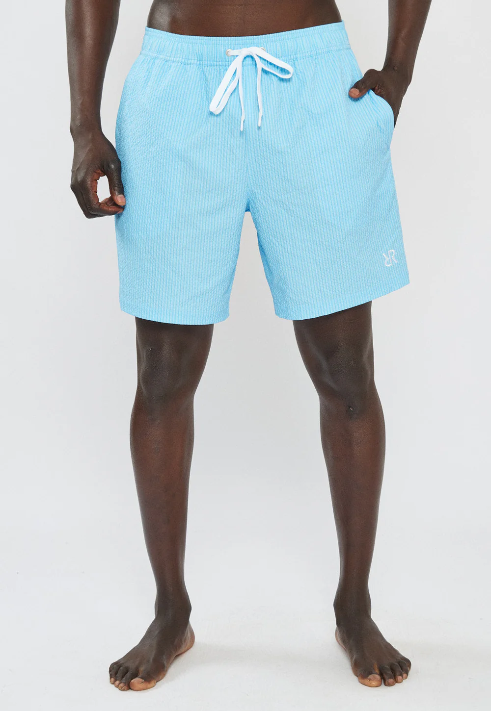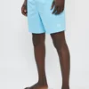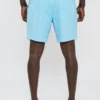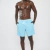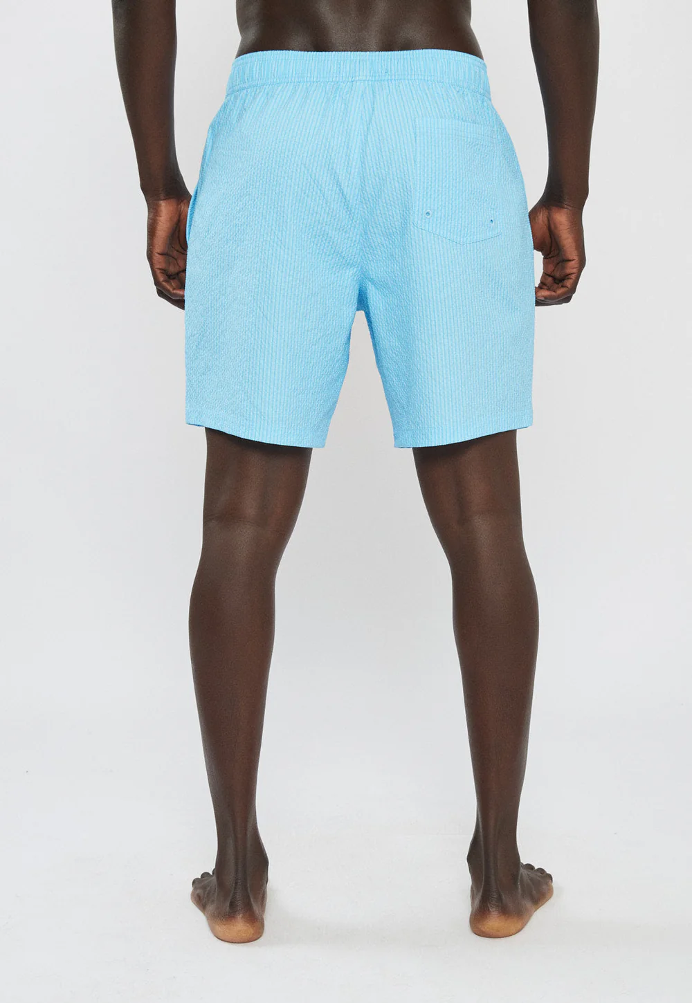 בגד ים לגברים בצבע תכלת עם פסים עדינים בגזרה נוחה ומשוחררת, עשוי בד קליל המתייבש במהירות לנוחות מקסימלית בים או בבריכה.