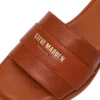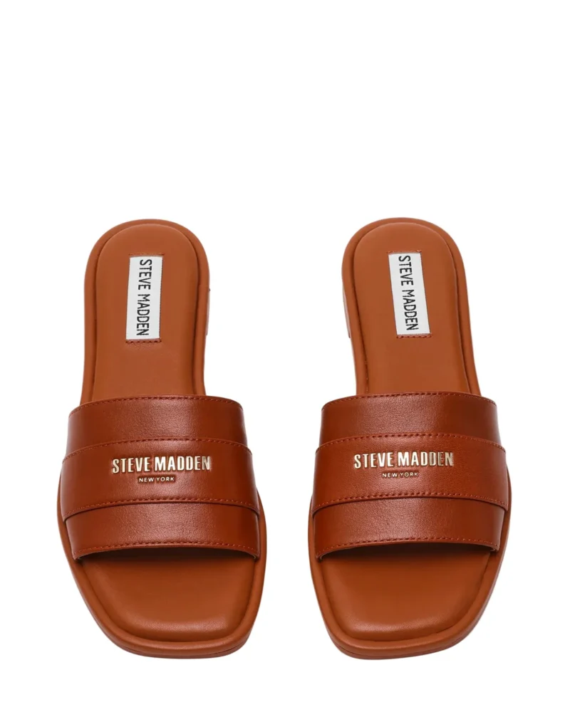 כפכפי עור שטוחים בקאמל לנשים עם לוגו מוזהב מבית סטיב מאדן.