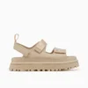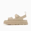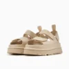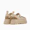 סנדלים מדגם Golden Glow מבית UGG, עשויים פוליאסטר ממוחזר עמיד בפני מים בשילוב סולית EVA קלת משקל ובצבע ורוד. לסנדלים שתי רצועות בחזית ורצועת קרסול הניתנות להתאמה אישית, בשילוב הטבעת לוגו המותג ובמראה צ'אנקי.